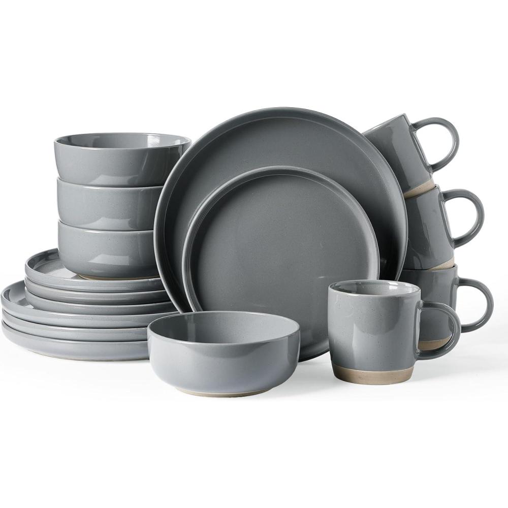 Famiware Milkyway Stoneware Dinnerware Sets with Mugs, Service for 4 (16pcs), Plates and Bowls Sets, Scratch Resistant, Microwave and Dishwasher Safe Dishes Set, White(Dark Gray)