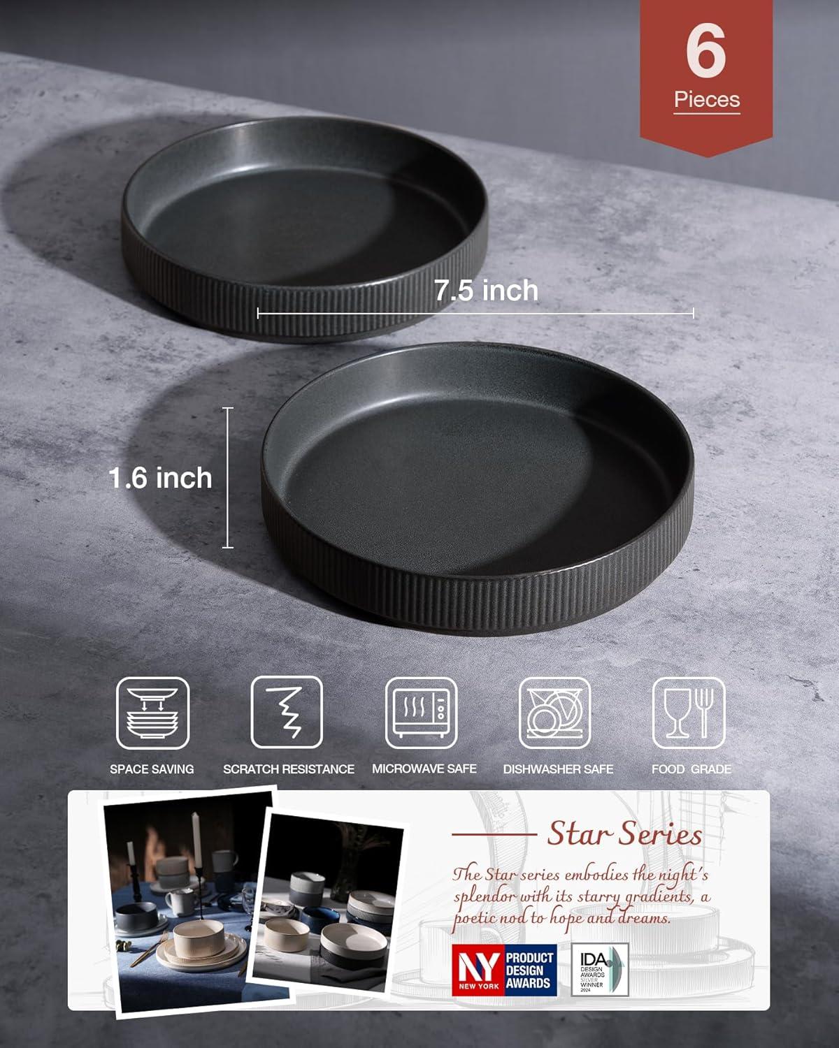 famiware Star 7.5″ Pasta Bowls Set, Salad Bowl Set of 4, Double Reactive Glaze, Stackable, Ideal for Your Friend for Housewarming, Festivals, Light Gray(Dark Charcoal – Full Glaze Matte)