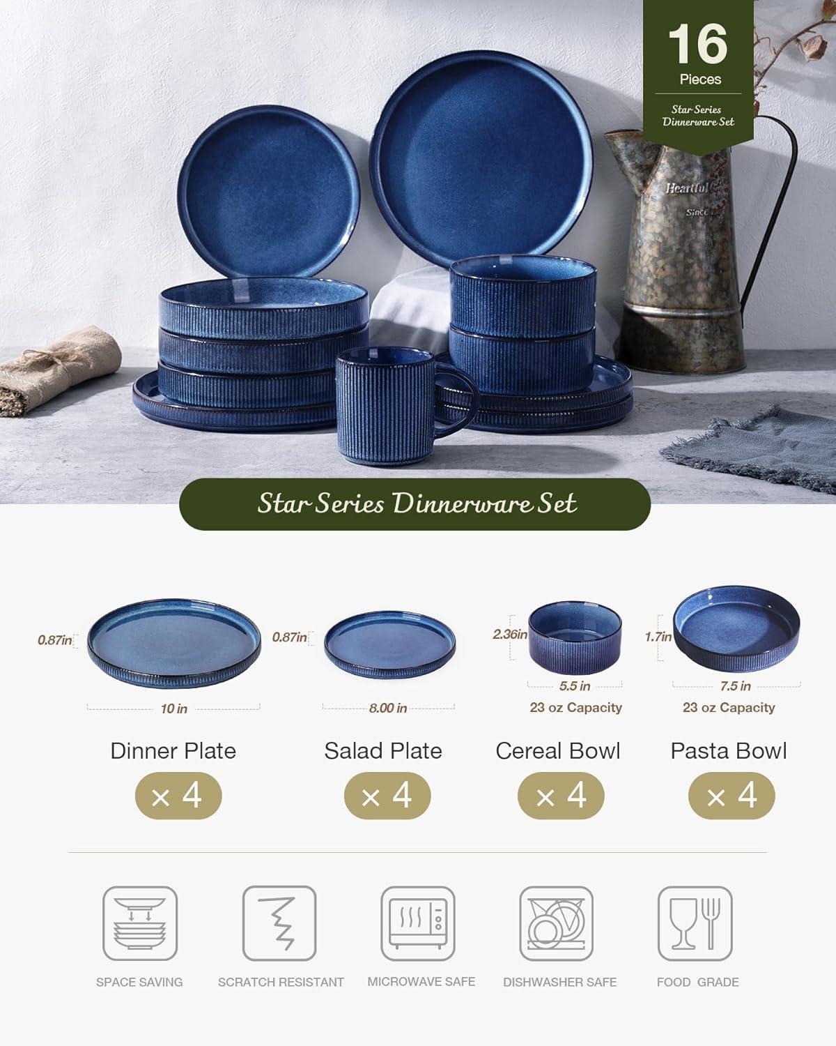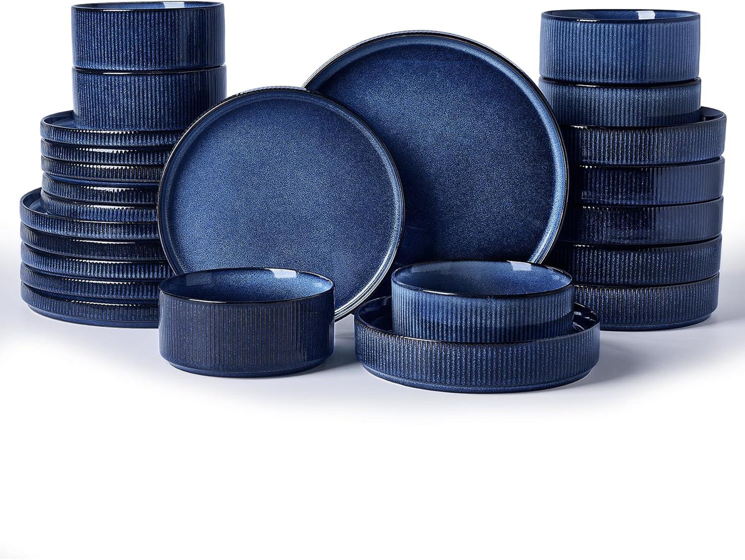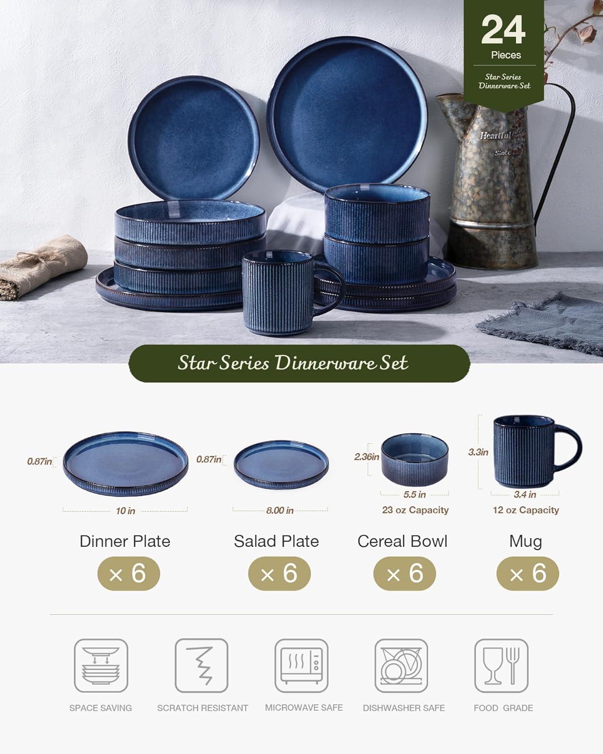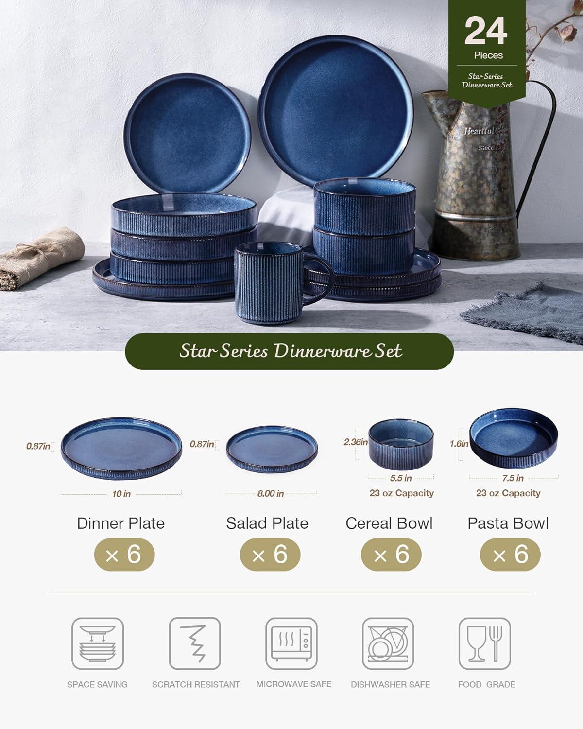 Famiware Star Dinnerware Set with Pasta Bowls, Service for 6 (24 Pieces), Ribbed Stoneware Plates and Double Bowls Sets with Trim - Chip & Scratch Resistant, Microwave & Dishwasher Safe Dishes, White(Nebulas Blue)