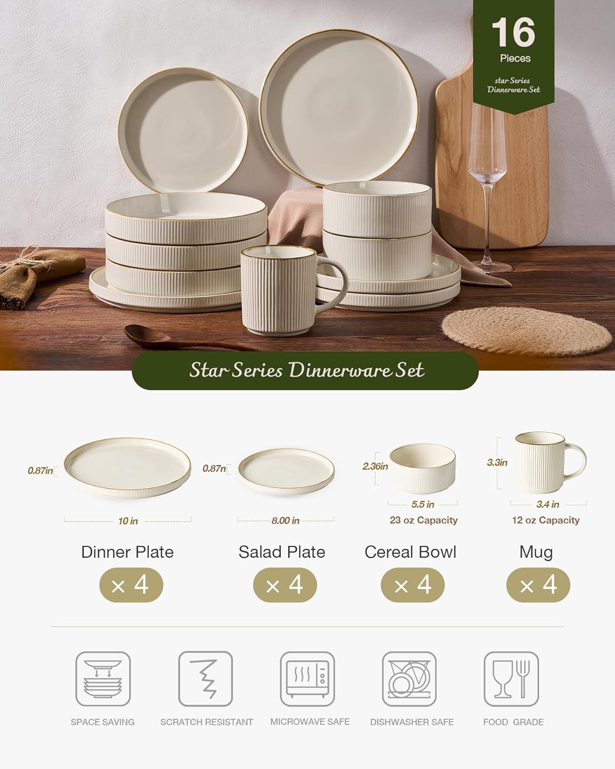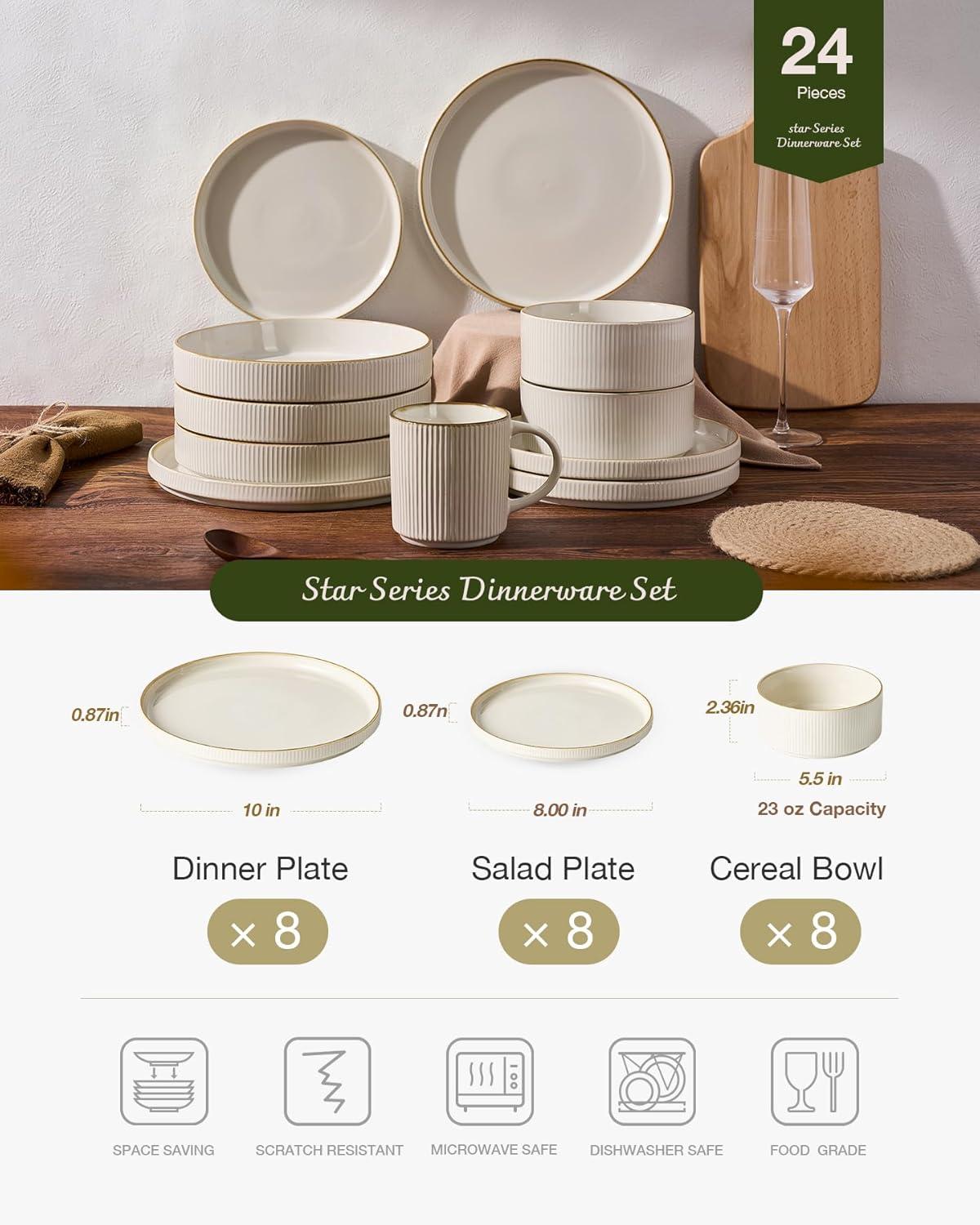 Famiware Star Dinnerware Set, Plates and Bowls Sets for 8 (24pcs), Ribbed Stoneware Dishes – Chip & Scratch Resistant, Microwave & Dishwasher Safe Tableware, Vanilla White(Cappuccino White)