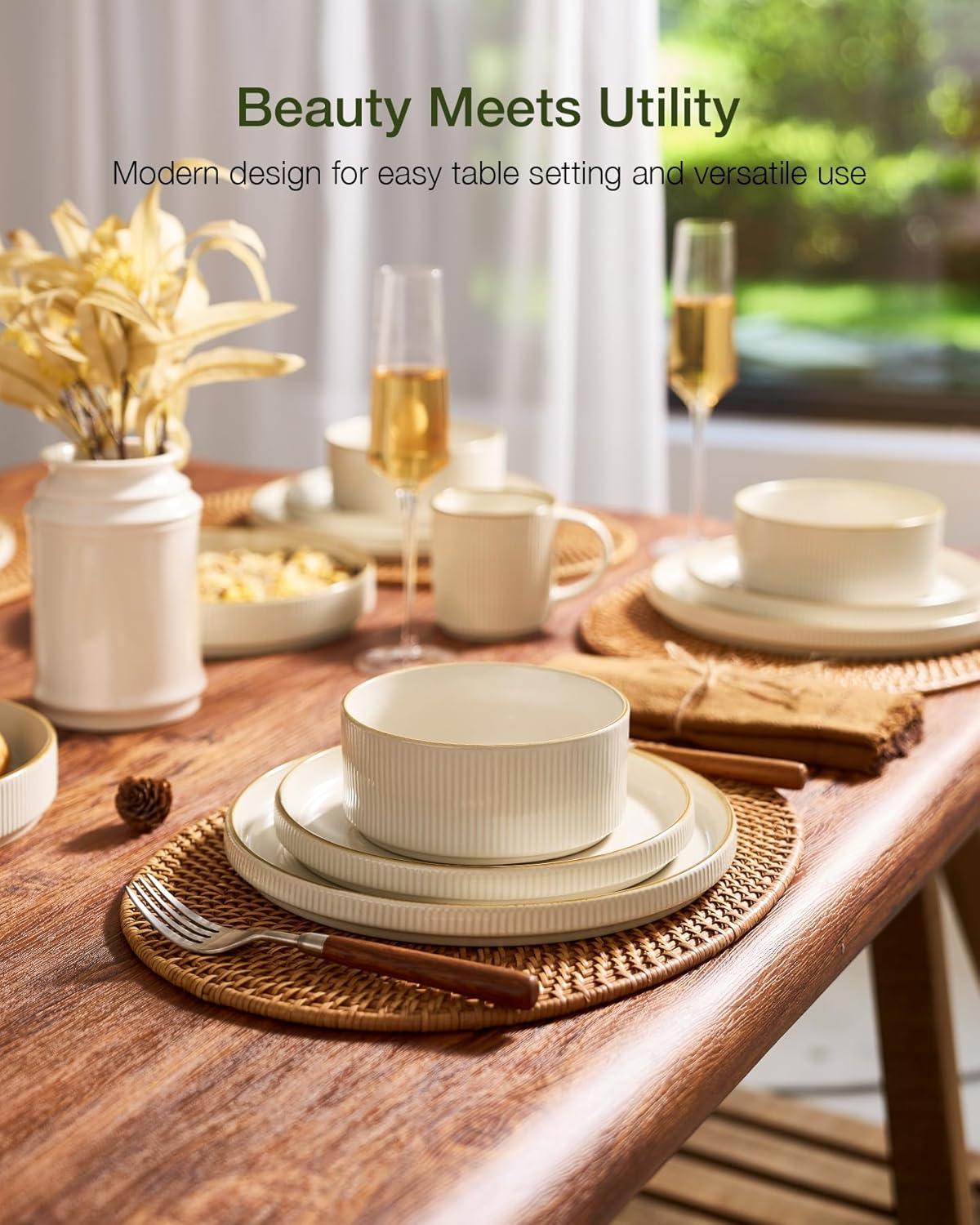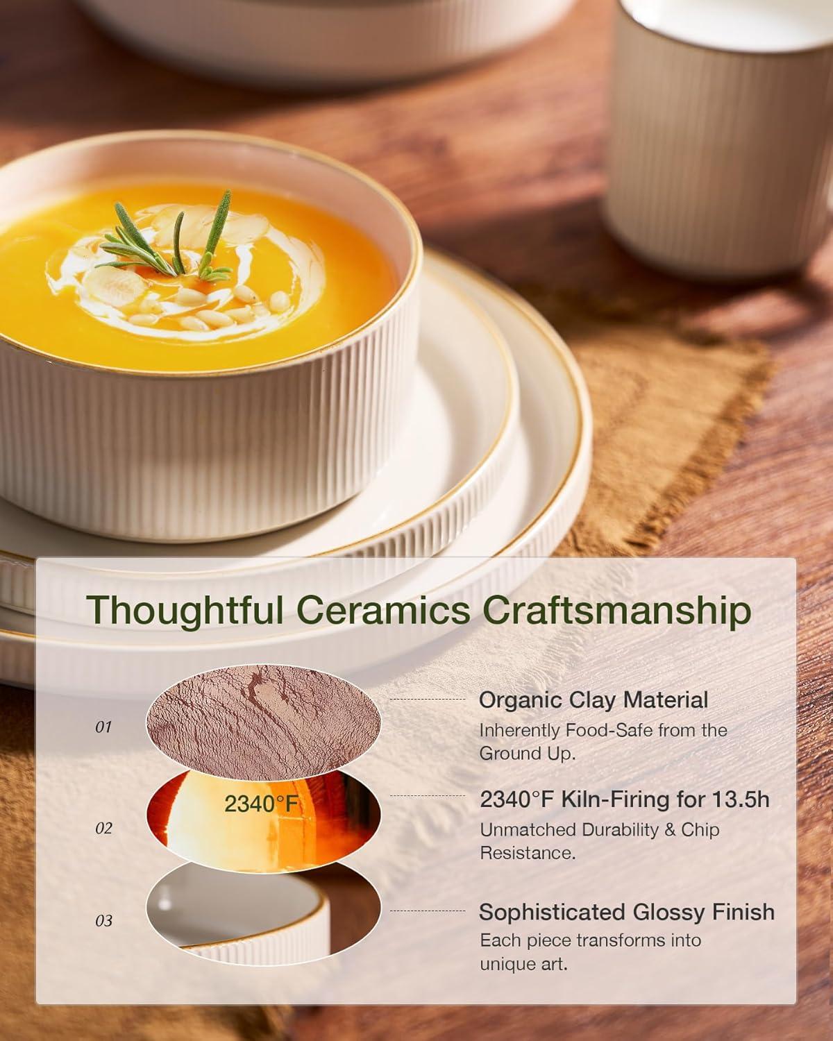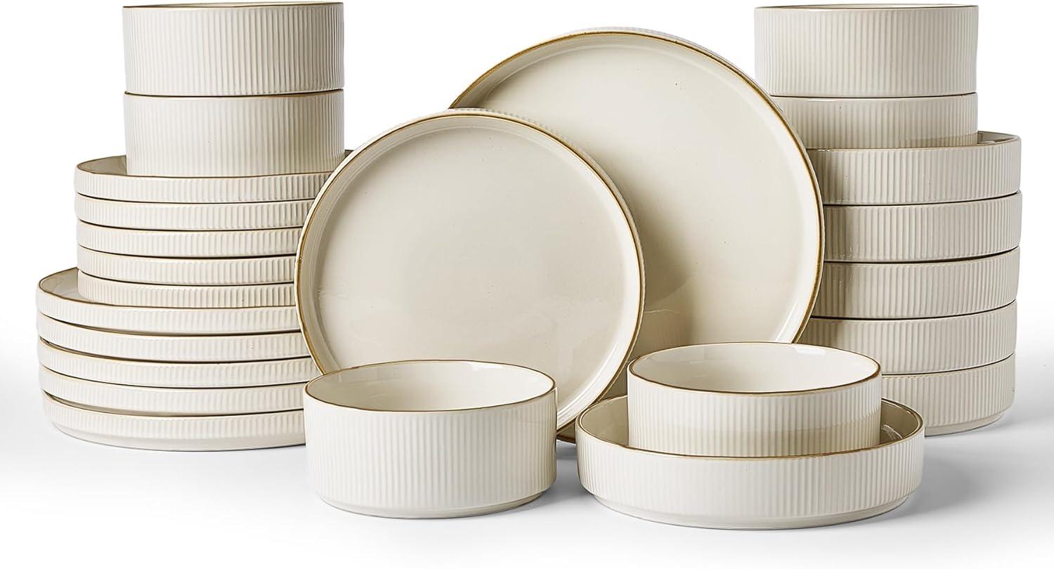 [Attractive Design]: Featuring a sophisticated glossy finish and hand-painted rims, this dish set combines elegant texture from its ribbed fluted edges with a versatile neutral palette to elevate any tablescape